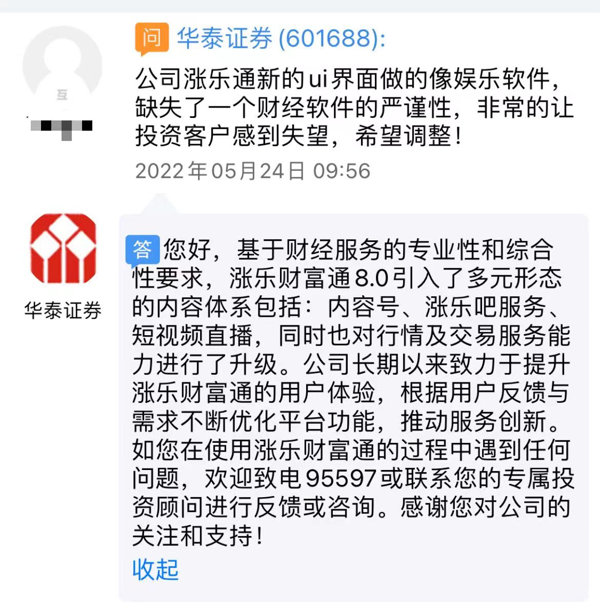 此外,多名投资者还提出华泰证券涨乐财富通APP改版后的使用体验不佳,并提出了相关建议。