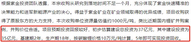 文章中还披露了此项投资回报测算。“初步估算建设总投资为37亿元,其中建设投资为35亿元,基建期2年,生产期18年,按碳酸锂价格10万元/吨计算,5年即可实现投资回收。”
