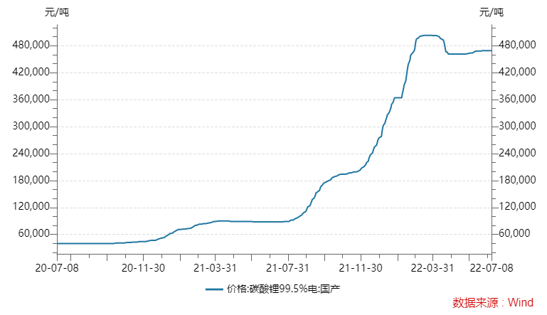 碳酸锂价格近一年大幅走高,由一年前8.8万元/吨涨至最高超50万元/吨,近几月仍居高不下,最新价格仍有46.90万元/吨。