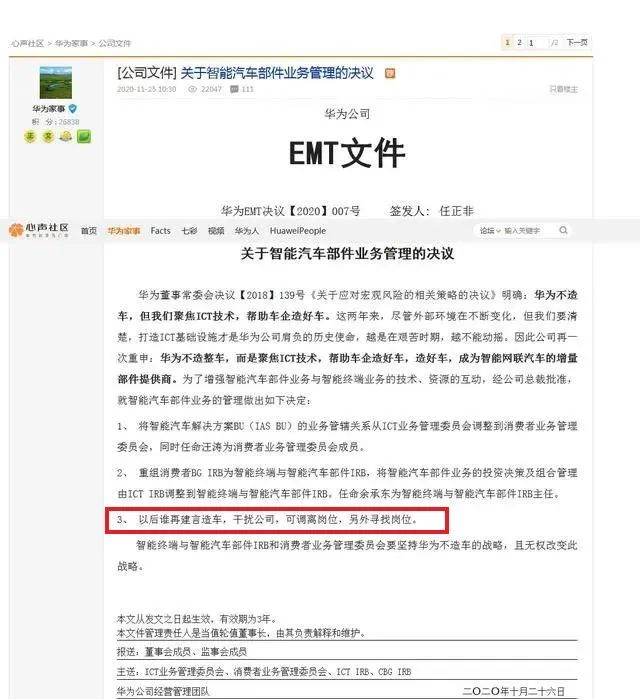 有人翻出任正非2020年签发的内部文件——《关于智能汽车部件业务管理的决议》,发现里面虽然提了华为不造车,任正非也强调了「谁在建言造车,干扰公司,可调离岗位」,但这份文件的有效期是3年,2023年作废。
