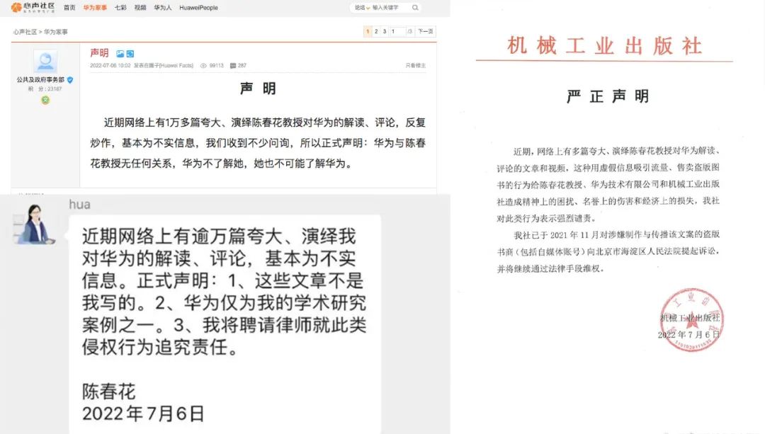 随后,陈春花也发表声明称,这类文章并非自己所写,华为仅是其学术研究案例之一,并表示将聘请律师对此类侵权行为维权。同时,与陈春花深度合作的机械工业出版社,也发布了维权声明。
