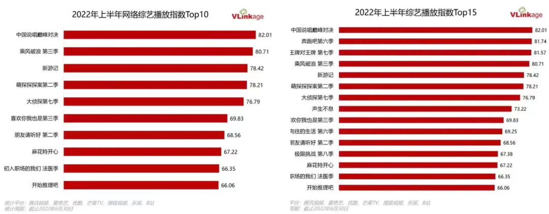 开播即是王炸,数据也印证了这一点:首期上线时,节目在爱奇艺的站内热度达9297,1000+全网热搜热榜,让说唱成为社交网站的霸榜话题。诸如#GAI赢麻了#、#万妮达福州方言rap#、#艾热千里万里唱出世界风#、#中国说唱巅峰对决太炸了#等话题,在微博、抖音、快手迅速引发网友的热烈讨论,节目口碑也随之发酵。同样,更令人不可思议的是,在Vlinkage发布的2022年上半年综艺播放指数TOP15以及上半年网络综艺播放指数TOP10榜单中,这样一档仅开播上线两周的节目,最终以82.01的成绩成为两个榜单上的TOP1。