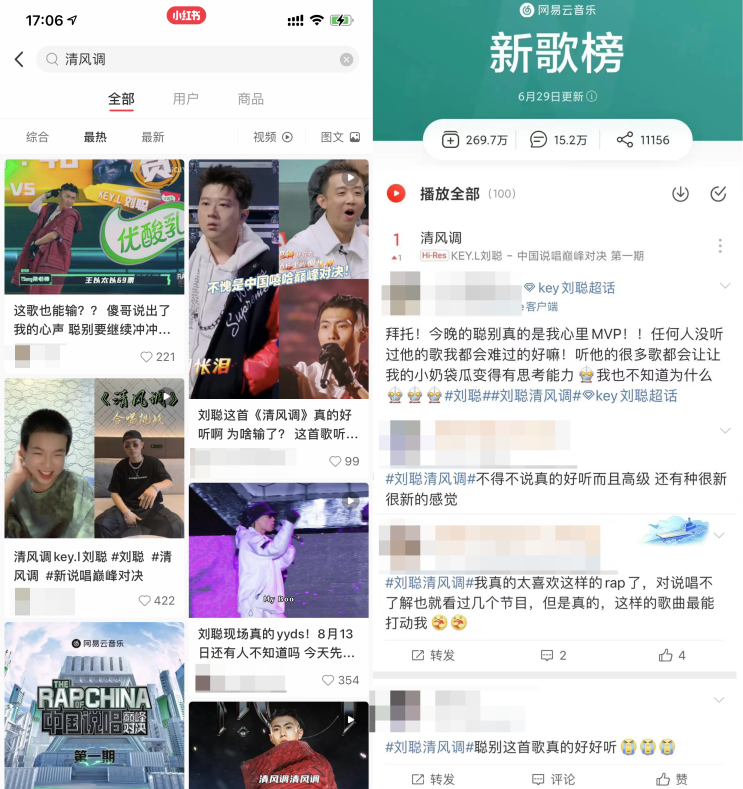 王以太的《骄傲》玩出了flow编排的“花样”和律动变化,像新式川菜那样极富想象力。刘聪的《清风调》,硬糖君愿意称其为近年来的中国风说唱神级佳作。“街头刮起了新风暴,都放在这首清风调。”由于太过上头,微博、小红书还有各音乐平台上,为《清风调》鸣不平的大有人在(包括硬糖君)。