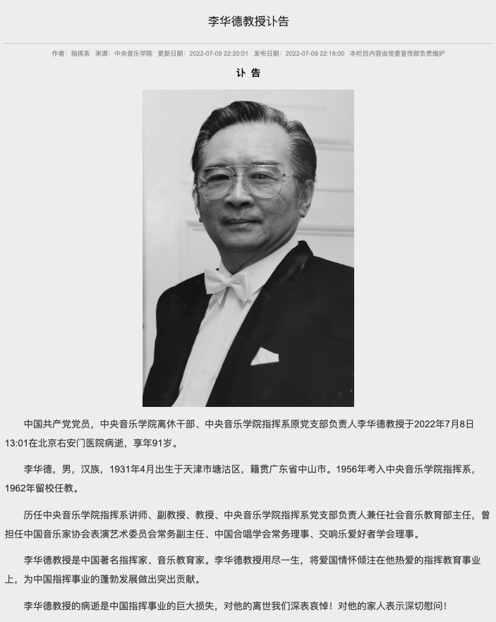 7月9日晚间,中央音乐学院官网发布讣告称,中国共产党党员,中央音乐学院离休干部、中央音乐学院指挥系原党支部负责人李华德教授于2022年7月8日13:01在北京右安门医院病逝,享年91岁。