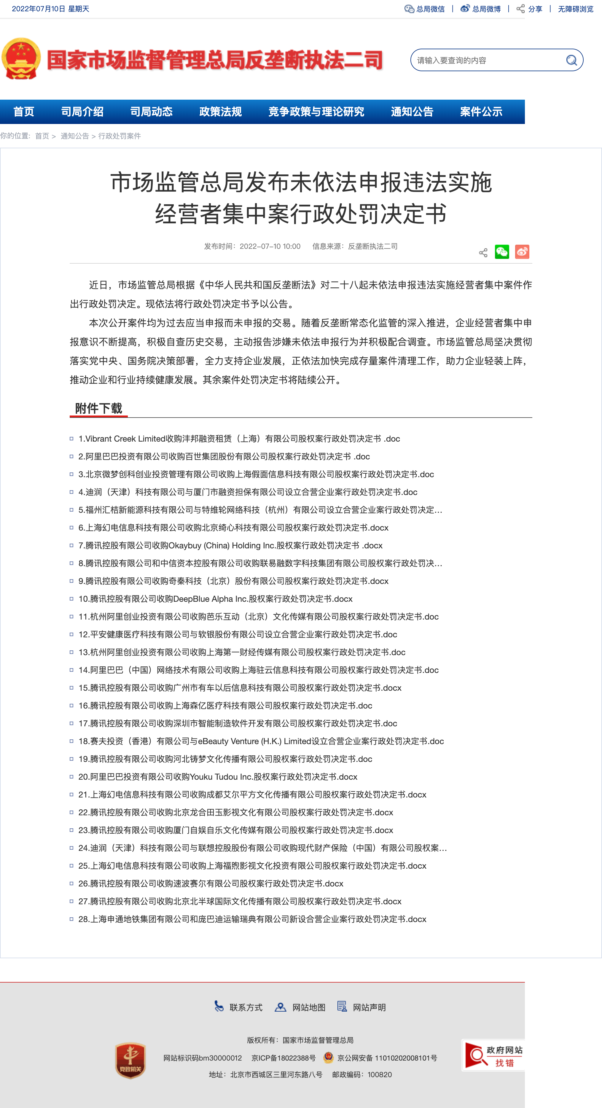 7月10日,市场监管总局公开了28起未依法申报违法实施经营者集中案件的行政处罚书。