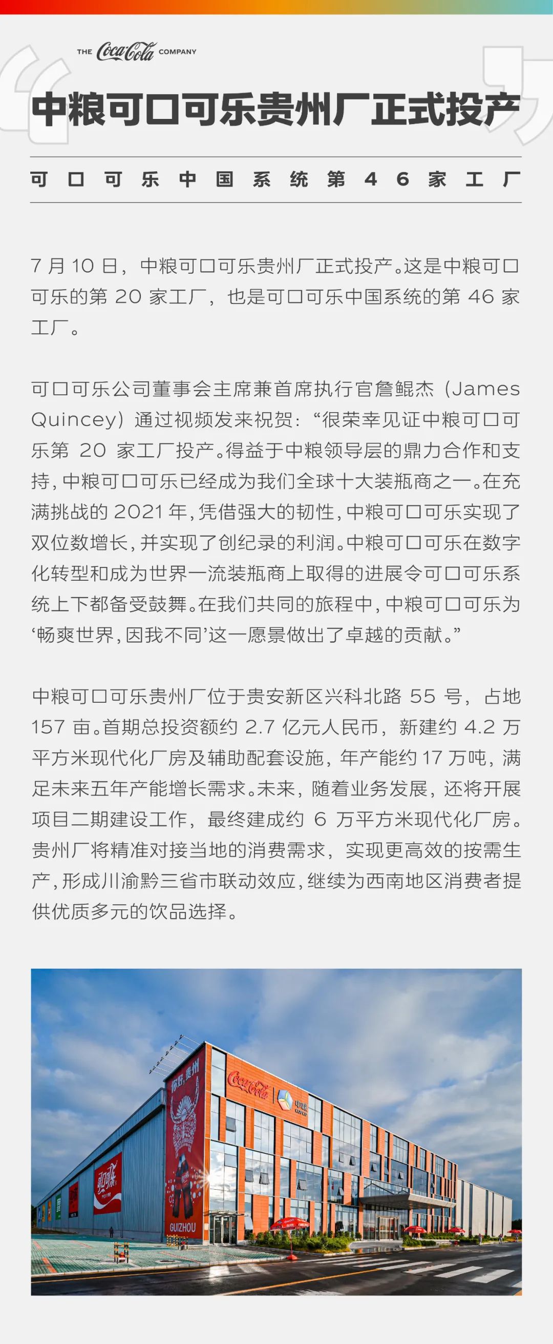 “可口可乐中国”微信公众号消息,7月10日,中粮可口可乐贵州厂正式投产。这是中粮可口可乐的第20家工厂,也是可口可乐中国系统的第46家工厂。