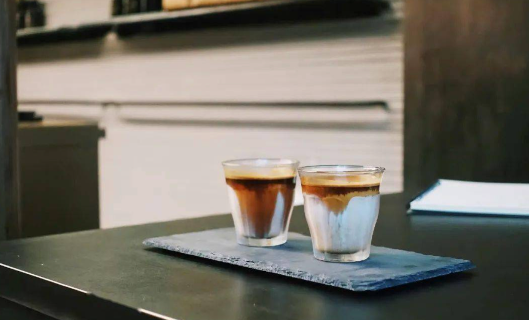 简单来说,这是一款用冰牛奶和Espresso调制的饮品。Espresso在制作时,热水高压冲击咖啡粉会饱和地溶解二氧化碳,由此产生包括着咖啡油脂的泡沫,而此时选用冰牛奶打底,咖啡液体流入时会产生分层与对冲效果,入口就是冷热分层、以及咖啡香醇与牛奶香甜的交汇体验。
