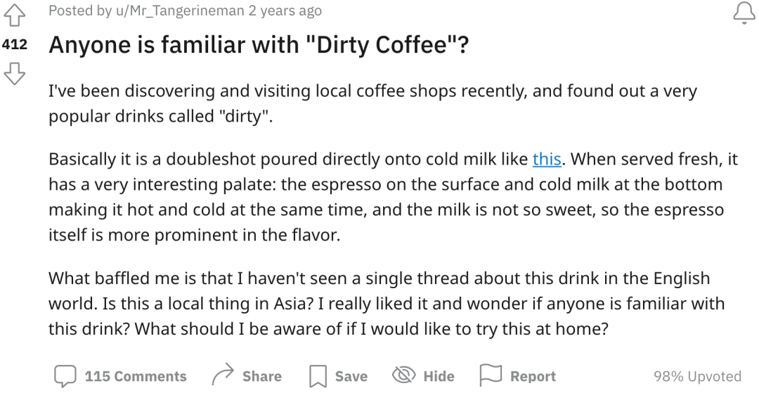 Dirty到底有多火?或许可以从美国网友的讨论中可见一二。两年前,当地内容社区Reddit上出现了一篇关于Dirty的讨论帖,这种来自亚洲的咖啡新物种,征服了很多美国人的心。