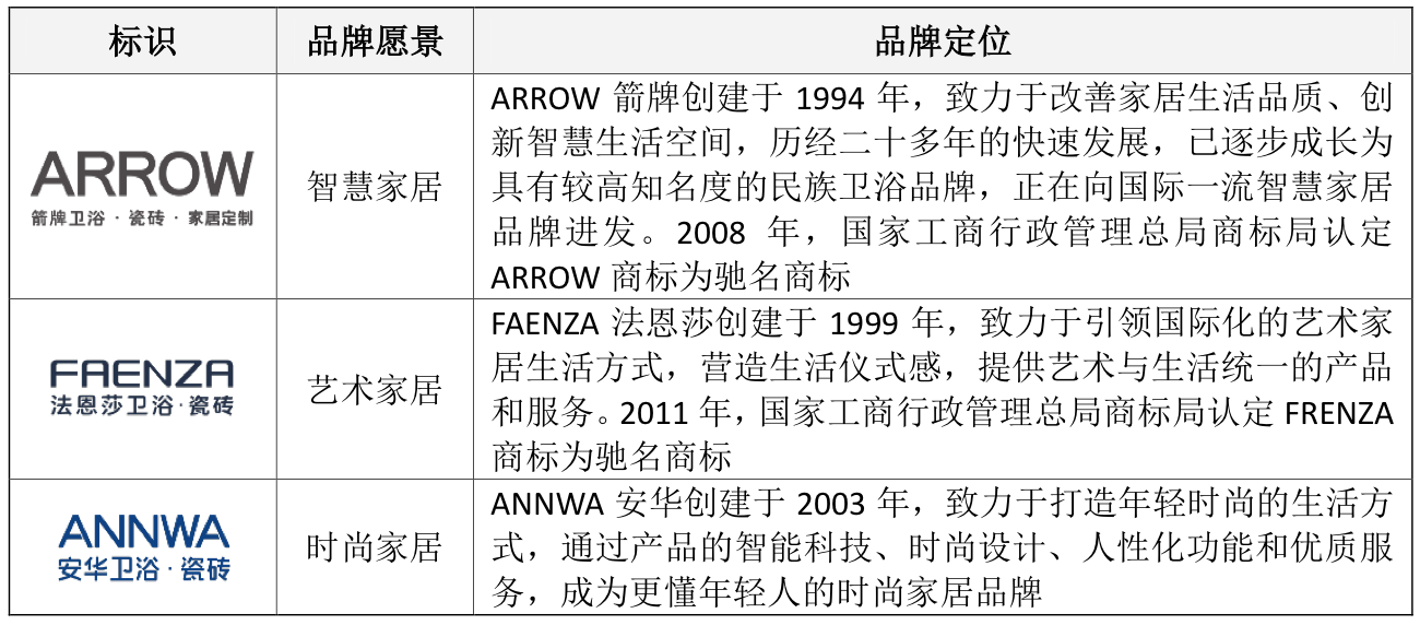 资料显示,箭牌家居的生产产品品类范围覆盖卫生陶瓷、龙头五金、浴室家具、瓷砖、浴缸浴房、定制橱衣柜等全系列家居产品,主要产品品牌包括ARROW箭牌、FAENZA法恩莎、ANNWA安华,三个品牌具有不同的市场定位,其中ARROW箭牌创建于1994年,2008年被认定为驰名商标;FAENZA法恩莎创建于1999年,于2011年认定为驰名商标,ANNWA安华创建于2003年。