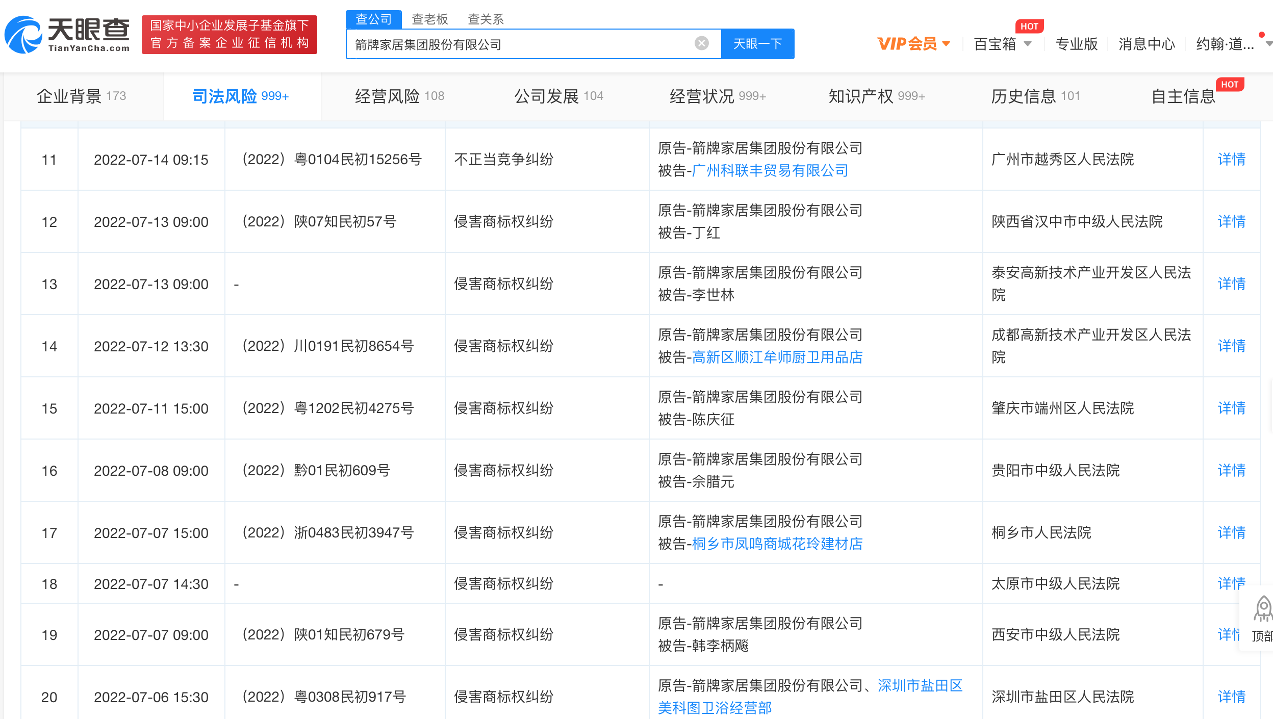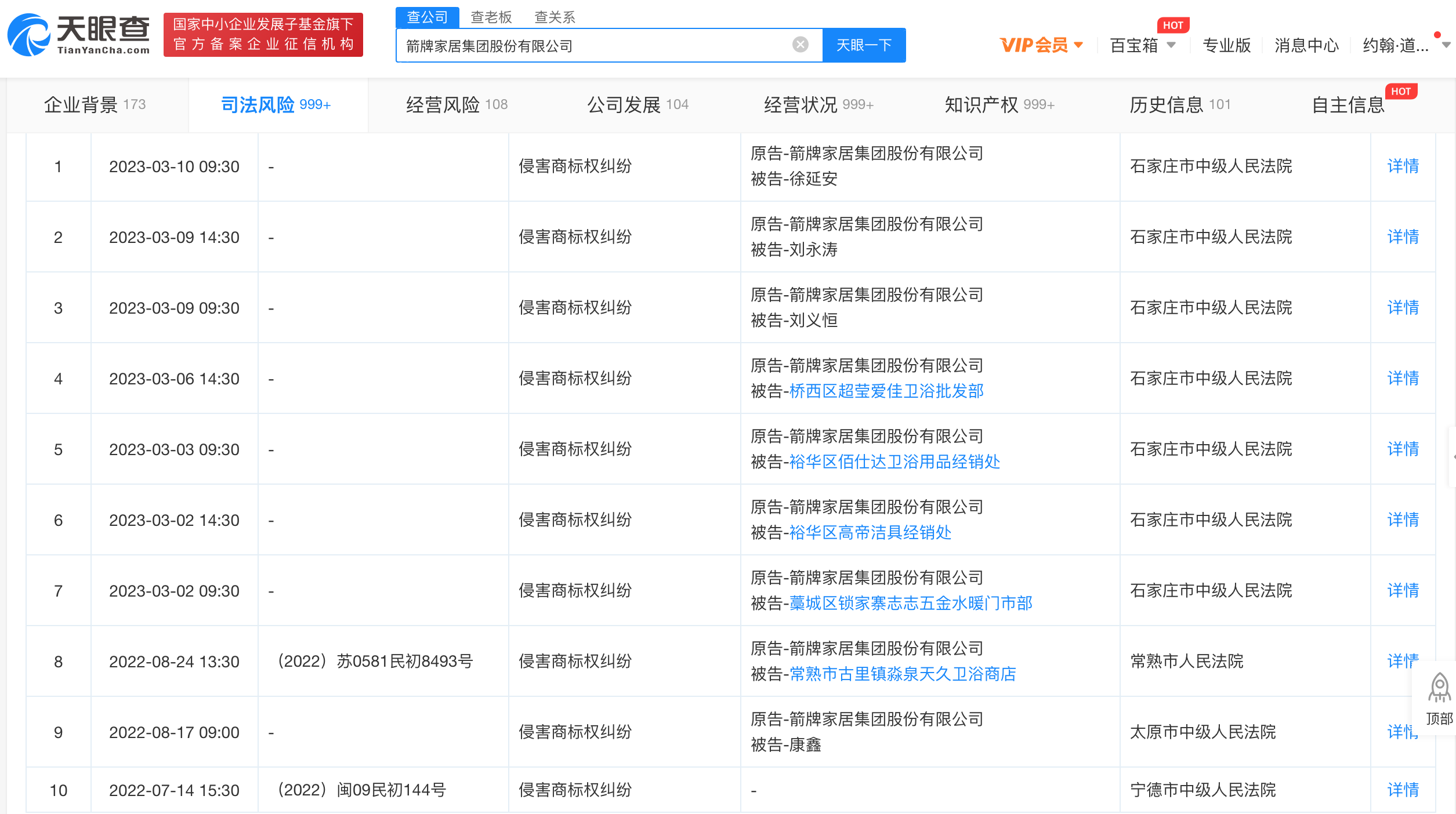 这还不是箭牌家居诉讼的全貌。从天眼查可以看到,箭牌家居的开庭公告多达78页,记录了从2016年11月7日以来的开庭信息,有777个记录。这中间包括了劳动合同纠纷、名誉权纠纷等,但侵害商标权纠纷最多。其中2022年,就有超过百个与商标纠纷有关的记录,2023年还将有7个开庭公告,全部显示为“侵害商标权纠纷”,纠纷的开庭日期甚至排到了2023年的3月10日。显然这已成了公司直面的一大烦恼。