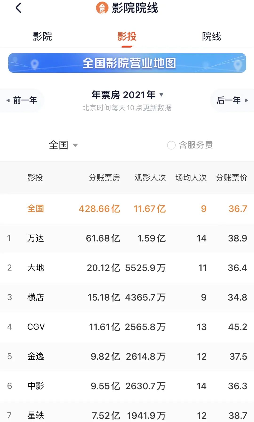 其次,便是进一步提升横店影视的市占率。截至2021年底,横店影视旗下开业影院共475家,年分账票房15.18亿,如果交易顺利完成,那横店影视的影院数量合计将达到603家,年分账票房合计达到22.7亿,超越大地院线成为影院规模和分账票房仅次于万达电影的存在。