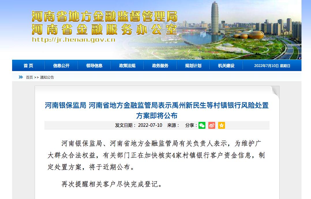 同日晚间,河南省地方金融监管局官网发布消息称,禹州新民生等村镇银行风险处置方案即将公布。河南银保监局、河南省地方金融监管局有关负责人表示,为维护广大群众合法权益,有关部门正在加快核实4家村镇银行客户资金信息,制定处置方案,将于近期公布。“再次提醒相关客户尽快完成登记。”