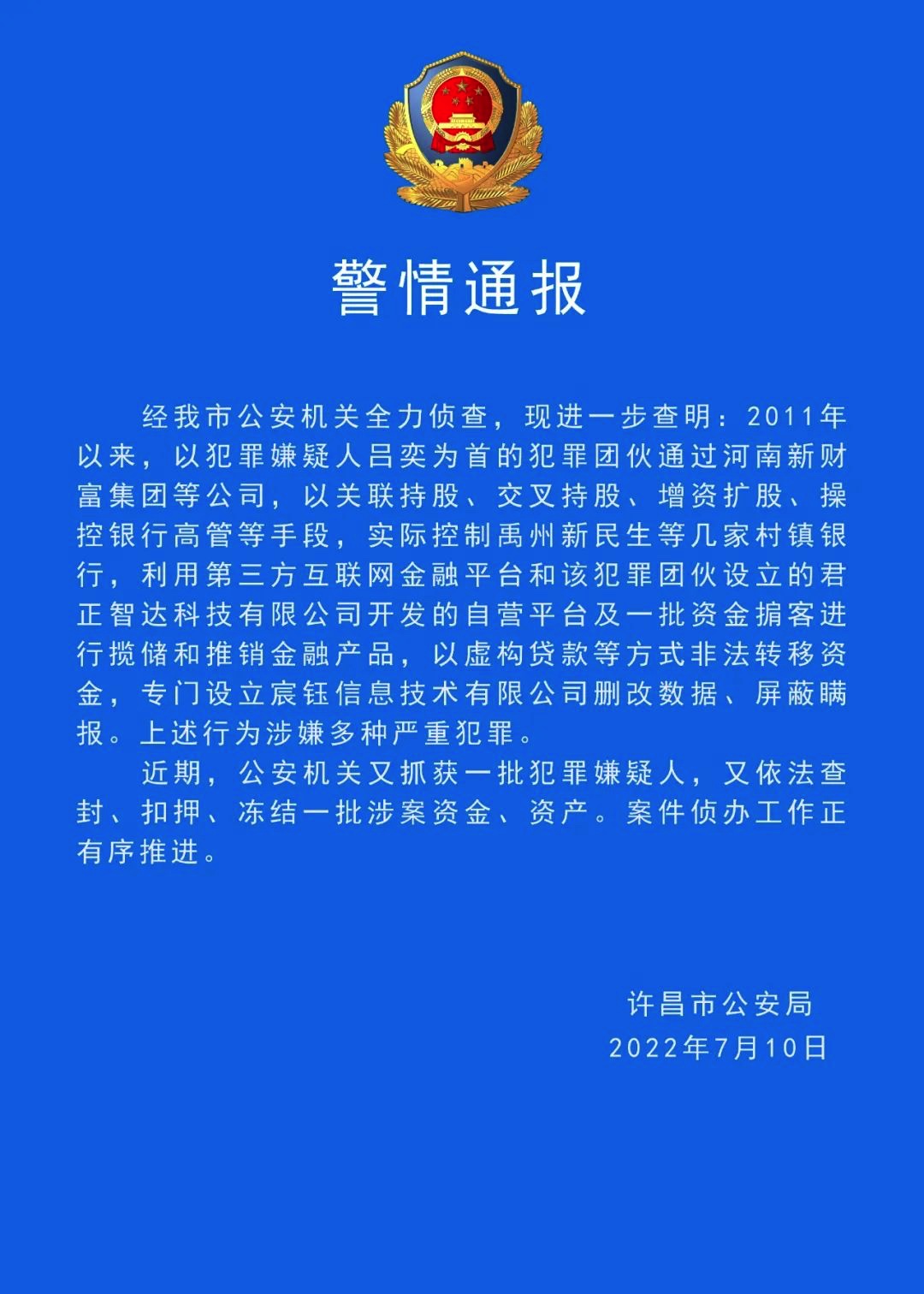 7月10日深夜,河南省许昌市公安局通报,近期,公安机关又抓获一批犯罪嫌疑人,依法查封、扣押、冻结一批涉案资金、资产,案件侦办工作正有序推进。
