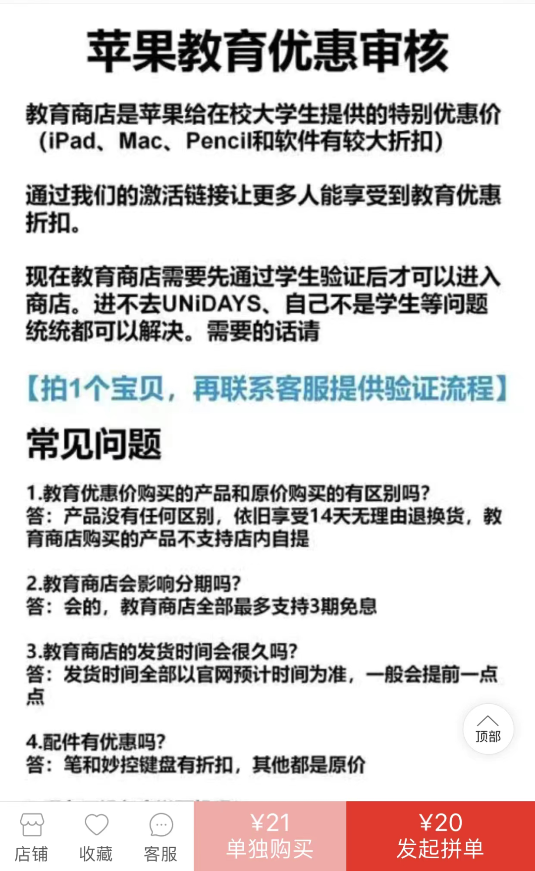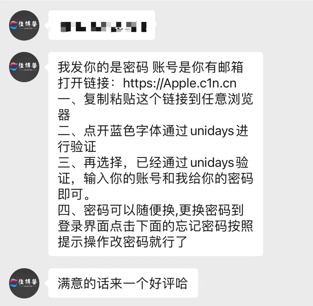 该店铺针对认证商品提供两种选择,一种是10元可购买苹果官网一次性认证,20元则可以获得为期一年的资格认证。支付成功之后,对方要求提供一个未注册UNiDAYS的邮箱,随即便发来密码和操作流程。