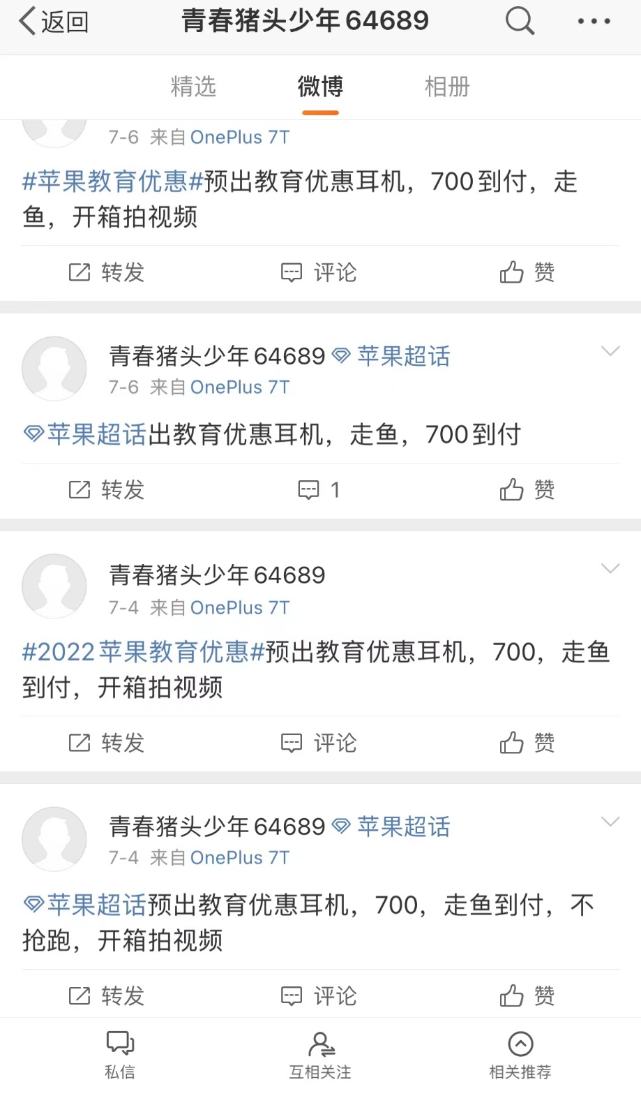 为此,小吴已经提前做起了生意。“预出教育耳机,大概7月中旬买,到付700”。从6月27日起,他在微博上已经发了十多条消息,希望能吸引到潜在买家。