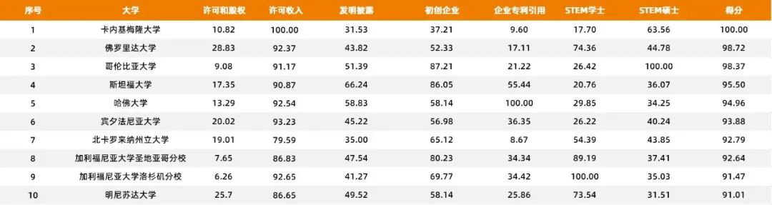 注:美国大学技术转化和商业化指数排名Top10