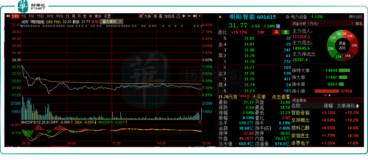 或许受此影响,7月8日,明阳智能低开低走,收跌7.54%,全天主力资金大幅流出,报收31.77元/股。