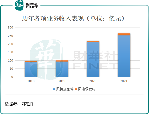 分业务看,风机及相关配件业务一直都是公司收入的“顶梁柱”,截至2021年度,为公司贡献92.96%的收入和83.09%的利润。此外,风电场发电业务近年来略有增长。