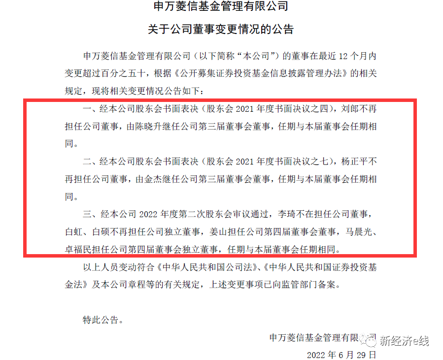 值得关注的是,自申万菱信基金原董事长刘郎因达法定年龄退休于去年7月1日离任一年以来,公司董事会也进行了“大换血”。