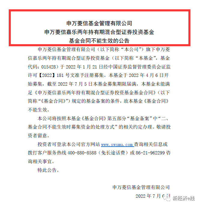 7月6日,申万菱信基金发布申万菱信嘉乐两年持有期混合型证券投资基金基金合同不能生效的公告称,本基金于2022年1月21日经证监会证监许可【2022】181号文准予注册募集。基金于2022年4月6日开始募集,截至2022年7月5日本基金募集期限届满,本基金未能满足基金合同规定的基金备案的条件,故本基金《基金合同》不能生效。