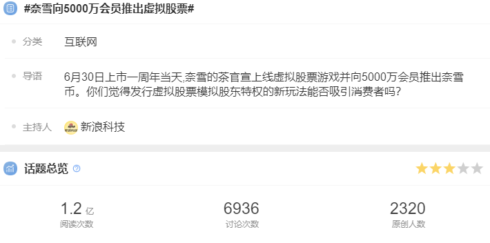 本质上,奈雪币就是一场营销活动。截至目前,#奈雪向5000万会员推出虚拟股票#的微博话题获得2亿次阅读。