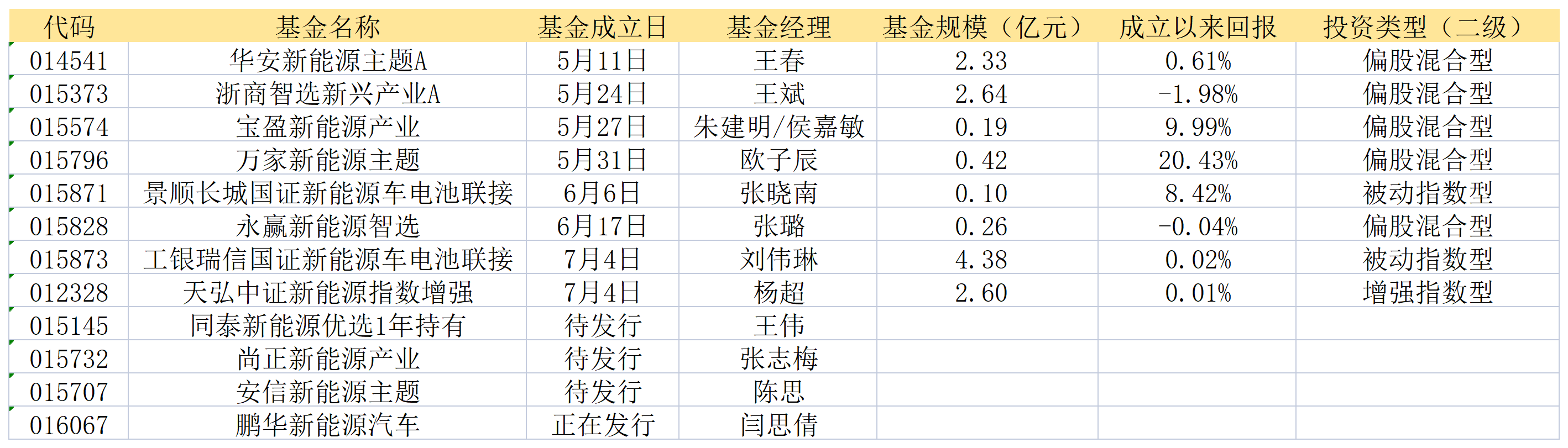 Wind数据显示,7月,还有鹏华、安信、同泰等4只新能源主题基金等待发行和成立。