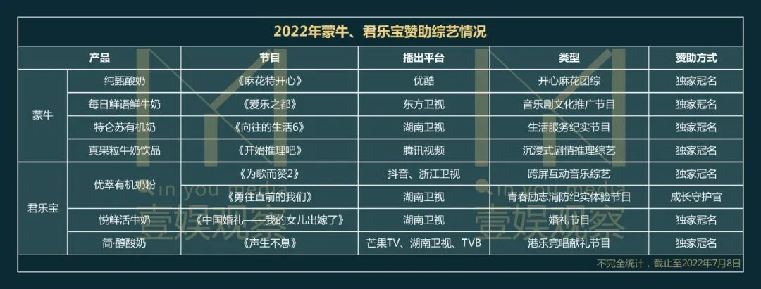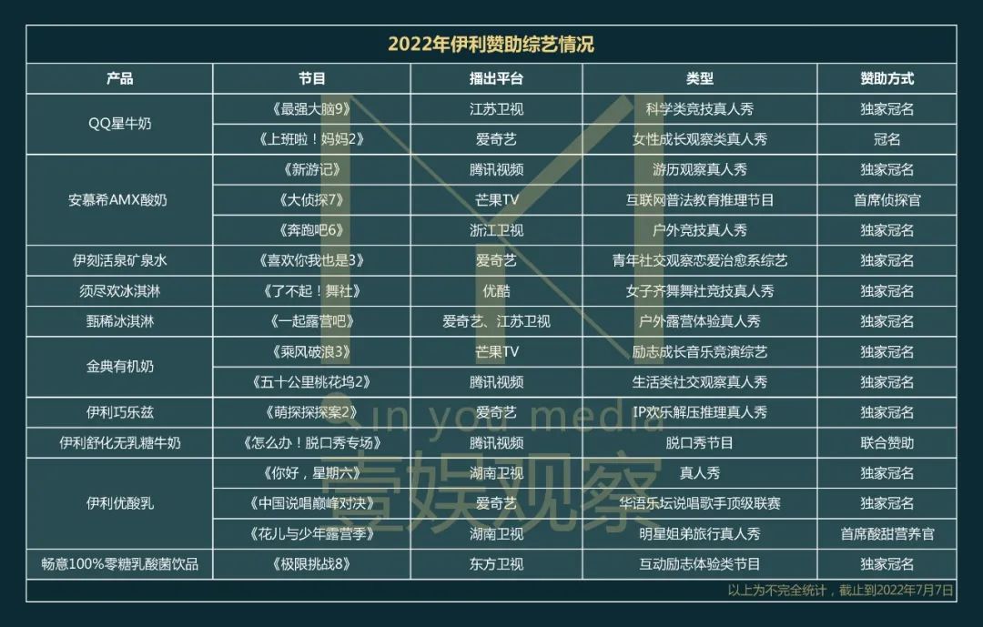 这句话同样被壹娱观察整理的2022年伊利综艺赞助情况所印证。