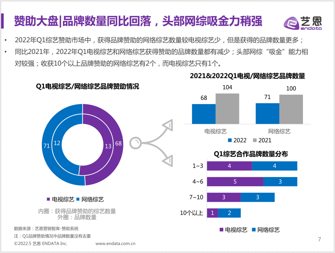 根据艺恩数据《2022Q1综艺赞助市场研究》显示,同比2021年,2022年Q1电视综艺和网络综艺获得赞助的品牌数量都有减少,前者减少了34.61%,后者则减少了29%,数量减少之余,投入综艺怀抱的品牌类型也在发生改变,2022年Q1饮料行业品牌表现依然强势,在品牌露出总时长方面依然领先,且品牌数量较2021年也有所上涨。