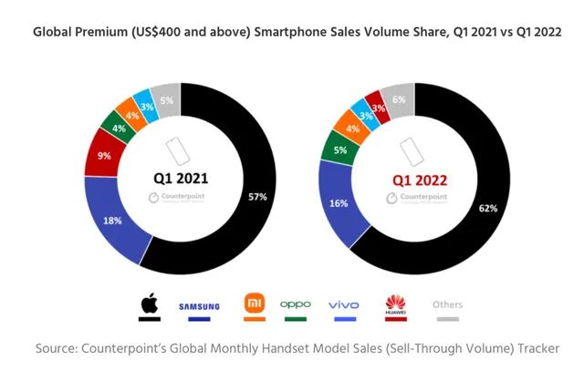 Counterpoint公布的最新数据显示,苹果在高端市场的份额在2022年第一季度达到了62%,达到了自2017年以来的最高水平。而以往在下半年,苹果才会迎来销售旺季。
