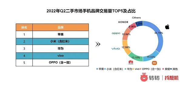 在二手市场也是如此,根据转转集团最新发布的Q2手机行情报告显示,苹果iPhone以34.79%的交易量排名二手市场品牌榜第一。