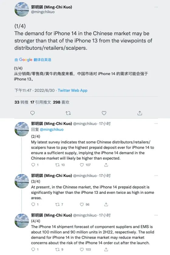 天风国际分析师郭明錤通过海外社交平台表示,以他对中国经销商、零售商和黄牛的调查来看,中国市场对iPhone 14的需求可能会强于iPhone 13。他们为 iPhone 14 支付了“有史以来最多的预付定金”。