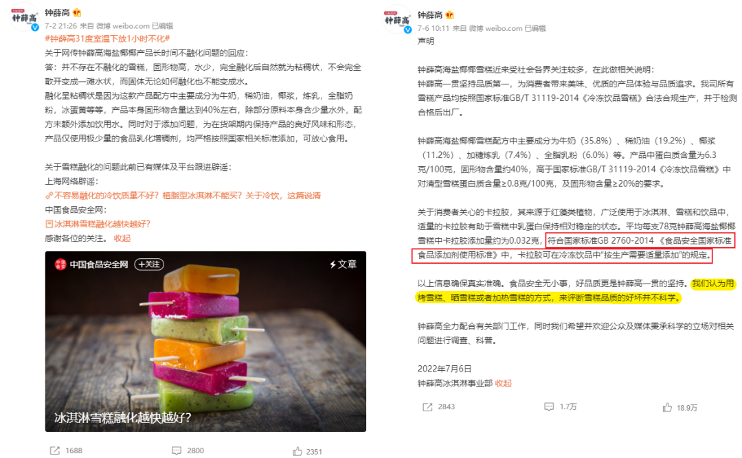 他们认为钟薛高生产的冷饮,卡拉胶含量符合国家标准GB2760-2014《食品安全国家标准食品添加剂使用标准》中规定计量,是正常的企业行为。
