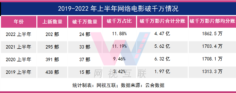 2022上半年,全网共有24部网络电影票房破千万,破千万影片占比为11.88%,呈逐年上升势态。比看似火爆的2019年,足足提升了8个百分点。