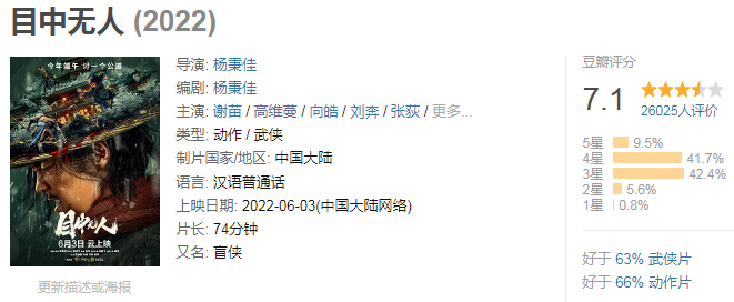 其中在爱奇艺“云影院”上线的武侠动作片《目中无人》,站内评分高达9.3,豆瓣2.6W+人评价,评分稳定在7.1分,获得了不俗的人气和口碑。此外,民俗惊悚片《山村狐妻》豆瓣6.5分,同样收获了很好的市场反响。