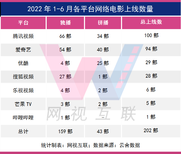 据云合数据提供给网视互联的数据显示,2022上半年各视频平台上线网络电影共202部。上新数量进一步缩减,同比下降了32%。