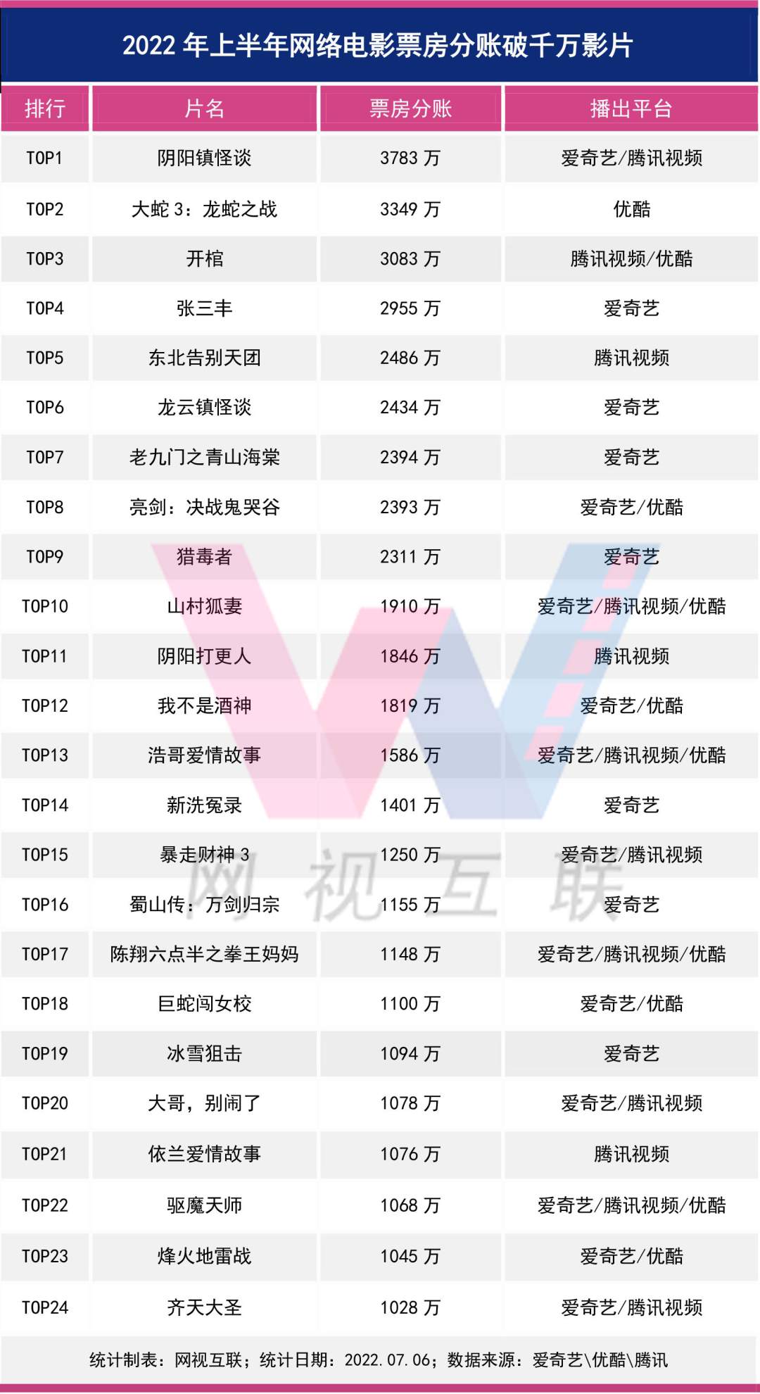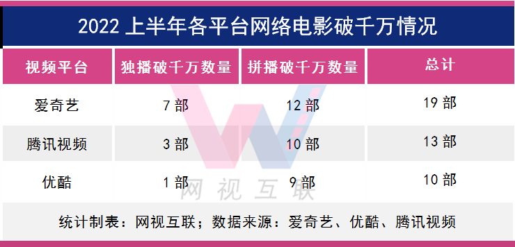 据网视互联统计,2022上半年爱奇艺、腾讯视频、优酷上新网络电影公开分账票房总规模为8.18亿。其中云影院上线的10部影片,搜狐视频、乐视、芒果TV、哔哩哔哩上线的近40部影片,以及爱优腾单日票房未进入榜单TOP25的影片,因未公开票房,并未计算入内。