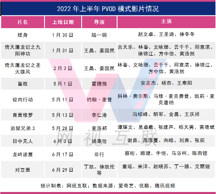 上半年,爱奇艺以PVOD模式在“云影院”上线的影片高达10部,分别是《纹身》《倚天屠龙记之九阳神功》《倚天屠龙记之圣火雄风》《盲战》《绞肉行动》《青面修罗》《逃狱兄弟3》《目中无人》《龙岭迷窟》《对立面》,数量同比翻了一番,比过去两年PVOD影片的总量还多。