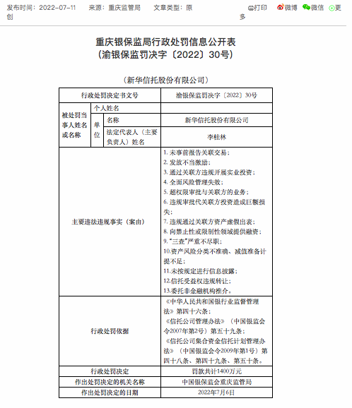 7月11日,银保监会官网信息显示,新华信托因存在未事前报告关联交易、发放不当激励、通过关联方违规开展实业投资等13项主要违法事实,被银保监会重庆监管局罚款1400万元,包括其董事长、总经理、首席风险官等16名相关负责人被罚。