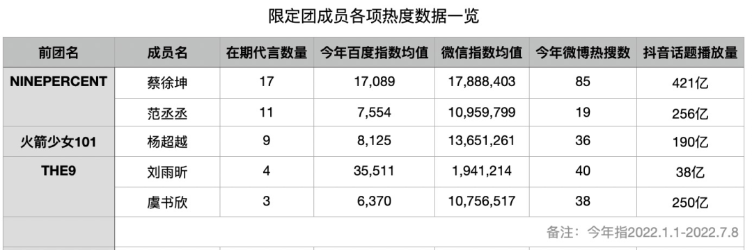硬糖君检索了所有限定团成员的百度指数、微信指数、微博热搜数以及抖音话题播放量,综合得出“热度”排名靠前的是蔡徐坤、杨超越、虞书欣、范丞丞。刘雨昕有点争议,微信指数、抖音话题播放量不高,但百度指数最高,甚至高于蔡徐坤。