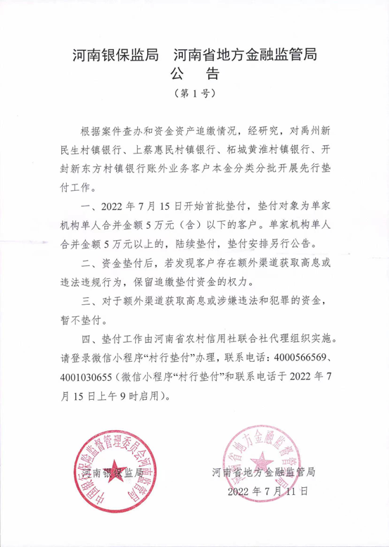 7月11日晚间,河南银保监局、河南省地方金融监管局发布公告称,根据案件查办和资金资产追缴情况,经研究,对禹州新民生村镇银行、上蔡惠民村镇银行、柘城黄淮村镇银行、开封新东方村镇银行账外业务客户本金分类分批开展先行垫付工作。