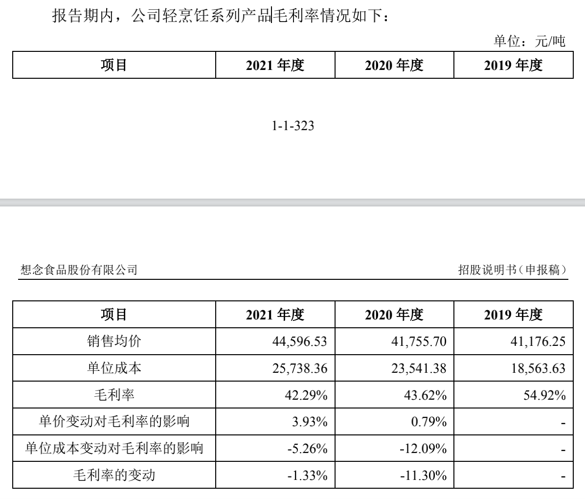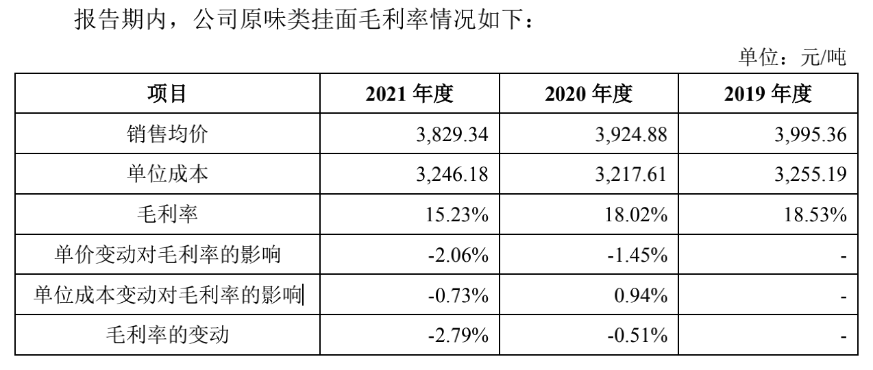 拆开看,想念食品原味类挂面2020年销售均价较2019下降70.48元/吨,2021年又较2020年下降了95.54元/吨,呈现连续下降的情形;与此同时,单位成本2021年较2020年上升了28.57元/吨,这一款产品2021年毛利率就比2020年少了2.79%。