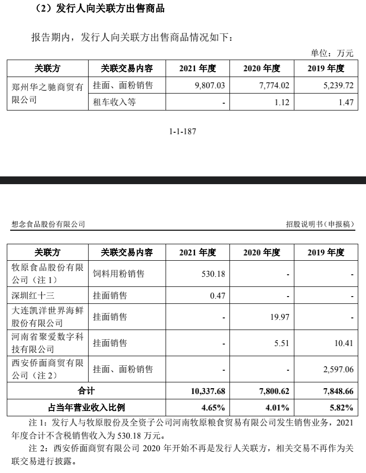 另外,从新版本说明书提供的情报,想念食品2021年向关联方出售金额只1.03亿元,占当年营业收入比例4.65%。
