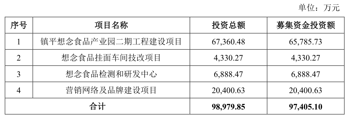 此番,想念食品计划募资9.74亿元,分别投入到镇平想念食品产业园二期工程建设项目,想念食品挂面车间技改项目,想念食品检测和研发中心,营销网络及品牌建设项目,投入最大的是第一个项目,拟投入金额6.58亿元。