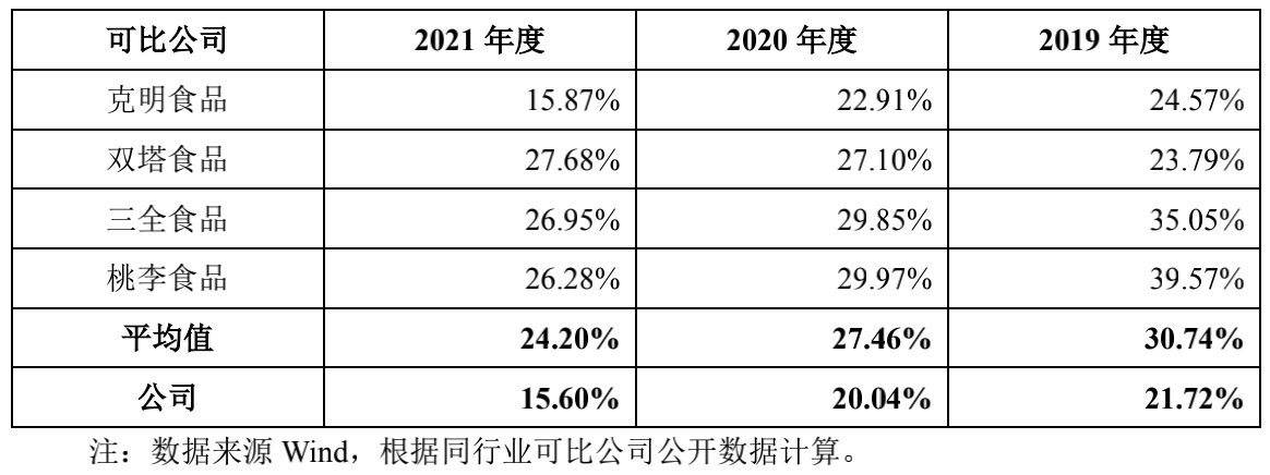 与可比公司的数据相较,想念食品2021年15.6%的毛利率也是最低的,克明食品(002661.SZ)为15.87%,双塔食品(002481.SZ)为27.68%,三全食品(002216.SZ)为26.95%,桃李面包(603866.SH)为26.28%。这其中克明食品以挂面生产销售为主,双塔食品以粉丝、豆类蛋白等产品生产销售为主,三全食品以速冻食品的生产销售为主,桃李面包以面包及糕点生产销售为主。