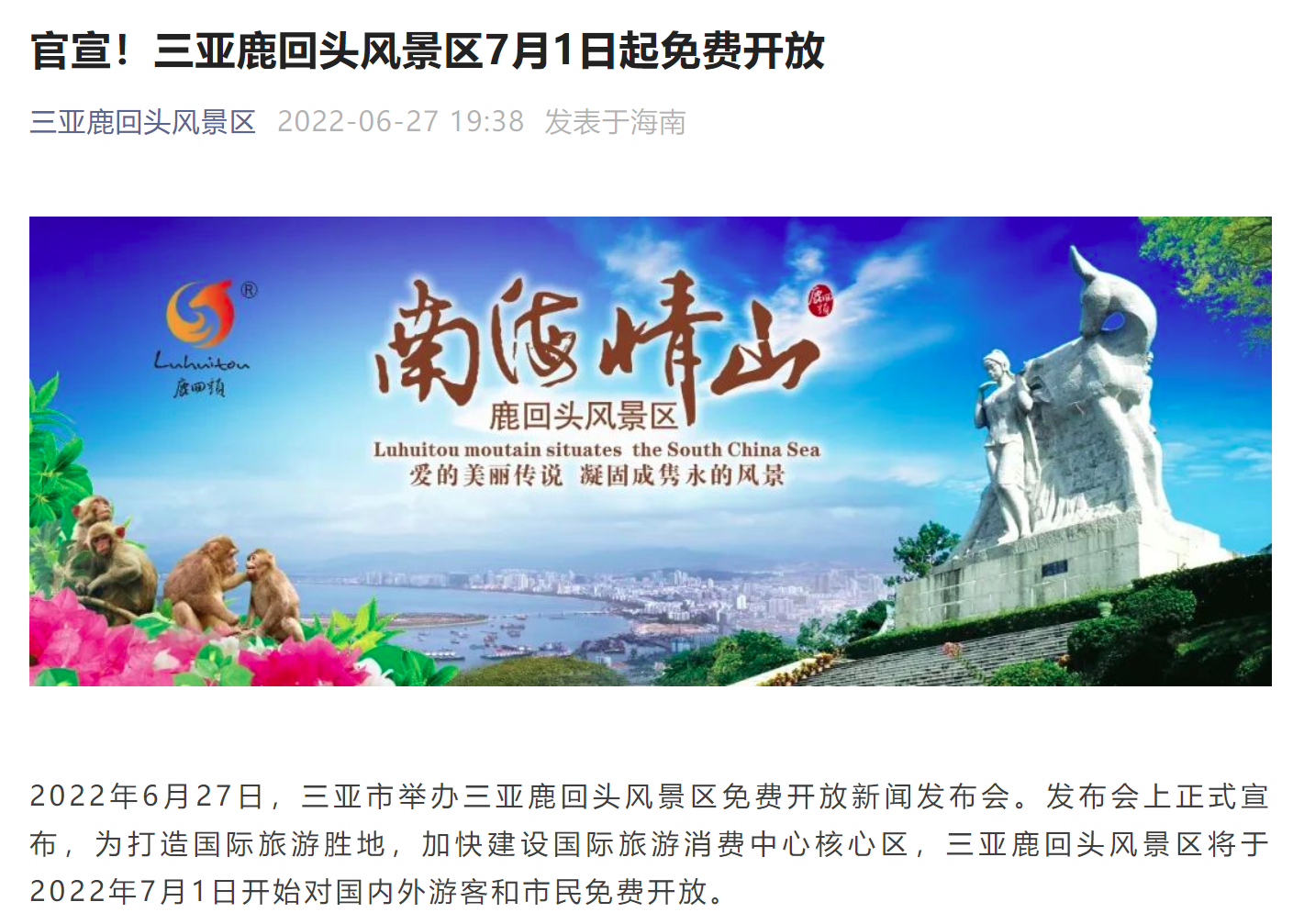 “为高水平打造国际旅游胜地,加快建设国际旅游消费中心核心区以及建设具有世界影响力的中国特色自由贸易港,我市决定:三亚鹿回头风景区将于2022年7月1日开始对国内外游客和市民免费开放。”6月27日,三亚市政府副市长严连勇在新闻发布会上宣布,鹿回头风景区免费开放后,将持续与三亚湾、大东海、临春岭等景点山海联动,打造三亚“城市会客厅”,不断提升三亚旅游城市形象,进一步扩大三亚旅游城市知名度,拓展客源市场,带动三亚旅游相关产业发展,促进旅游消费提质升级。