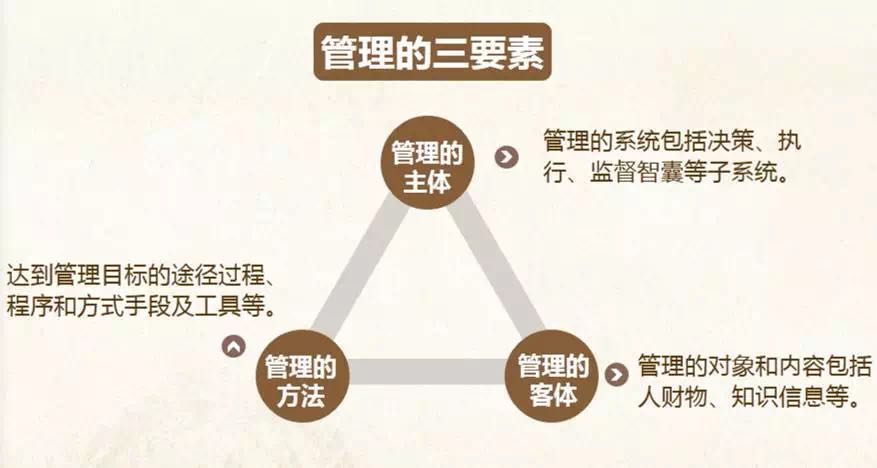 管理的主体就是管理系统,包括决策,执行,监督等子系统;管理的客体就是管理对象,包括人财物,知识信息等,主要是被管理者;管理的方法是达到管理目标的途径过程、程序和方式手段及工具,也就是用什么样的方法将管理者和被管理者之间结合起来。