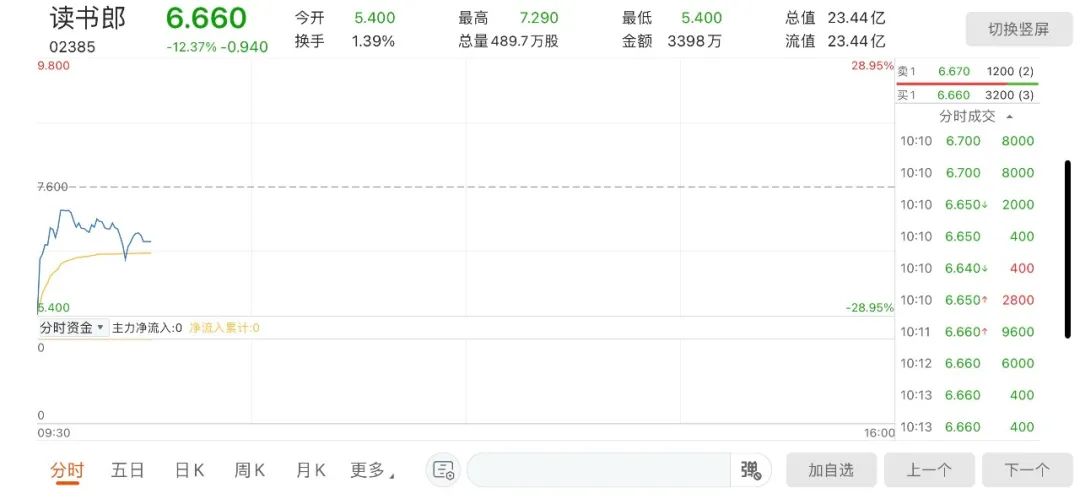 开盘价为5.4港元(折合约4.62人民币)/股,开盘下跌28.95%,随后呈小幅上涨趋势,读书郎股价维持在6.6港元(折合约5.65人民币)/股左右,截至智东西10点14分成文,股价为6.66港元(折合约5.70人民币)/股,下跌12.37%,市值为23.44亿港元(折合约20.06亿人民币)。