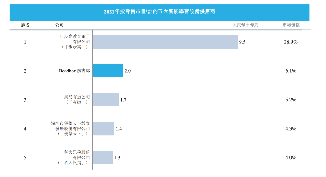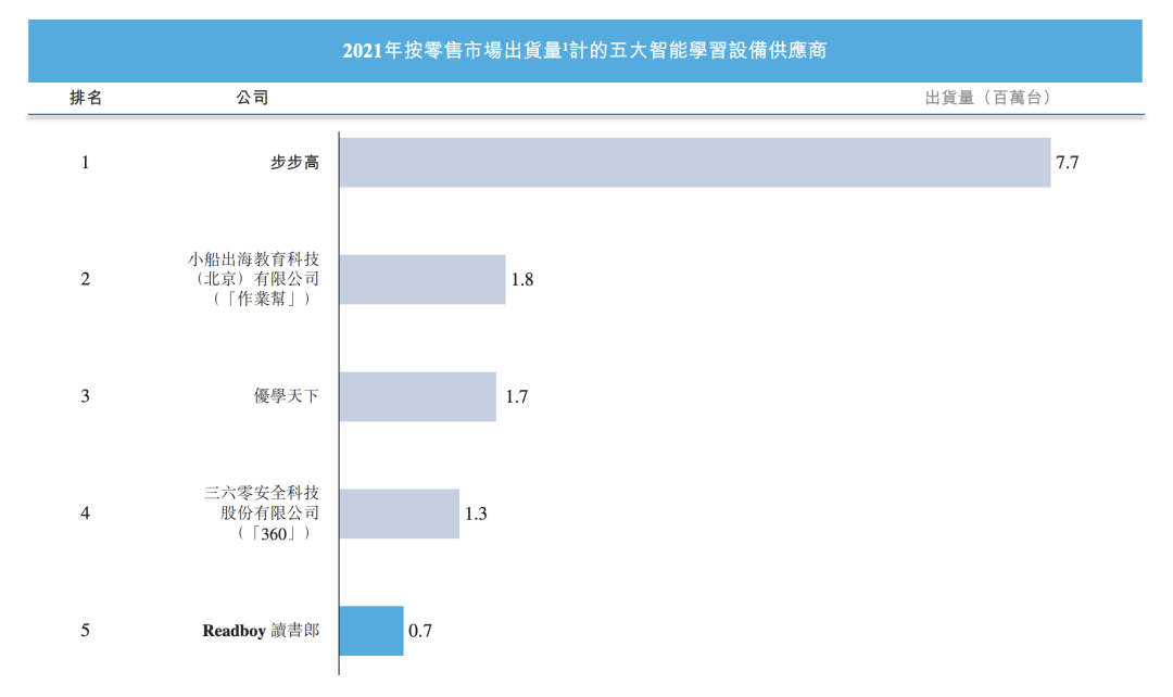 市研机构弗若斯特沙利文的数据显示,2021年按零售市值统计的中国智能学习设备服务供应商排名中,读书郎排第二,其市场份额为6.1%,就设备出货量而言,读书郎在中国智能学习设备服务供应商中排名第五,其2021年出货量为70万台。