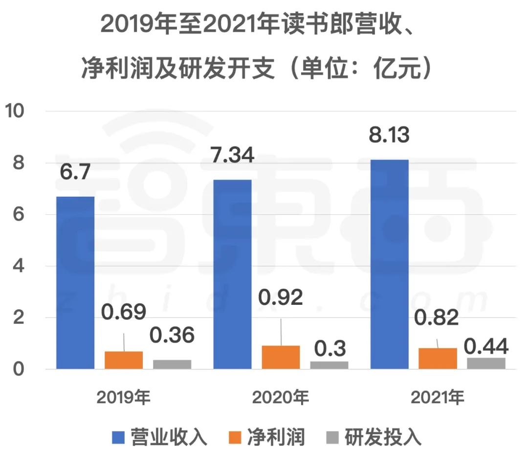 2019年、2020年至2021年,读书郎的营收分别为6.70亿元、7.34亿元、8.13亿元,净利润分别为0.69亿元、0.92亿元、0.82亿元。