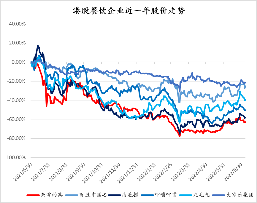 再回到股价上来看,用奈雪的茶上市这一年来的股价对比港股餐饮友商。可见,同行的众多玩家股价普遍是下行走势,只不过盈利能力相对较差的奈雪股价走势最弱。